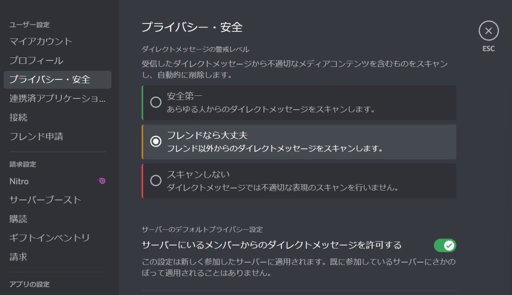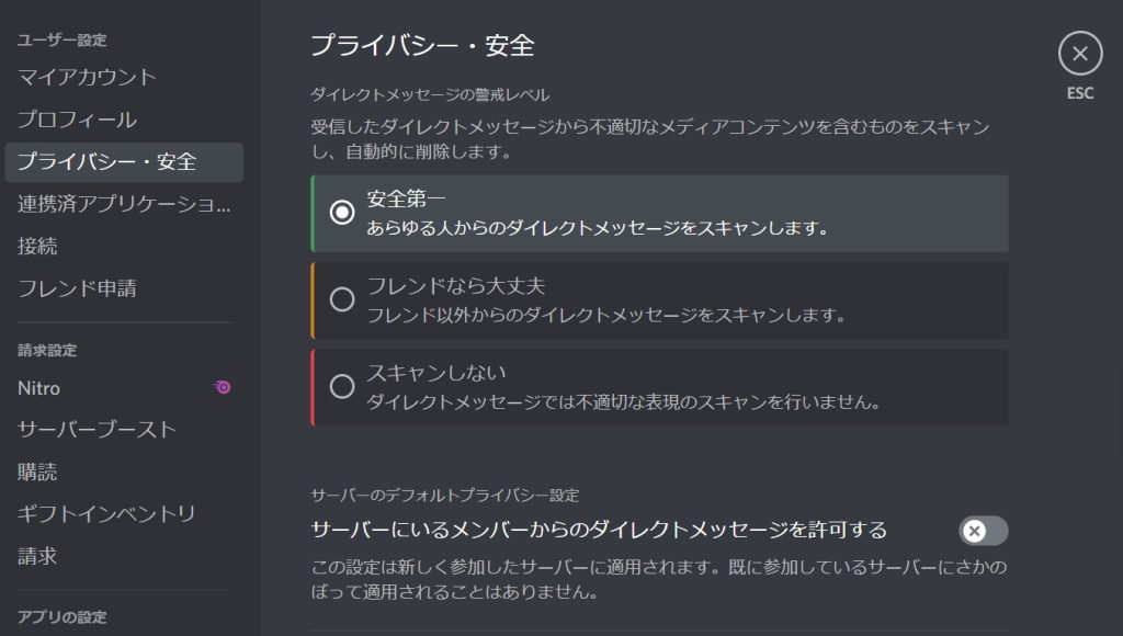 最初は「画像左」の設定となっておりますが、「画像右」の設定へと変更してください。Discord内のコミュニティでも注意喚起が継続的になされますが、DM(ダイレクトメッセージ)は100%詐欺です。まずはDMが届かない設定としましょう。